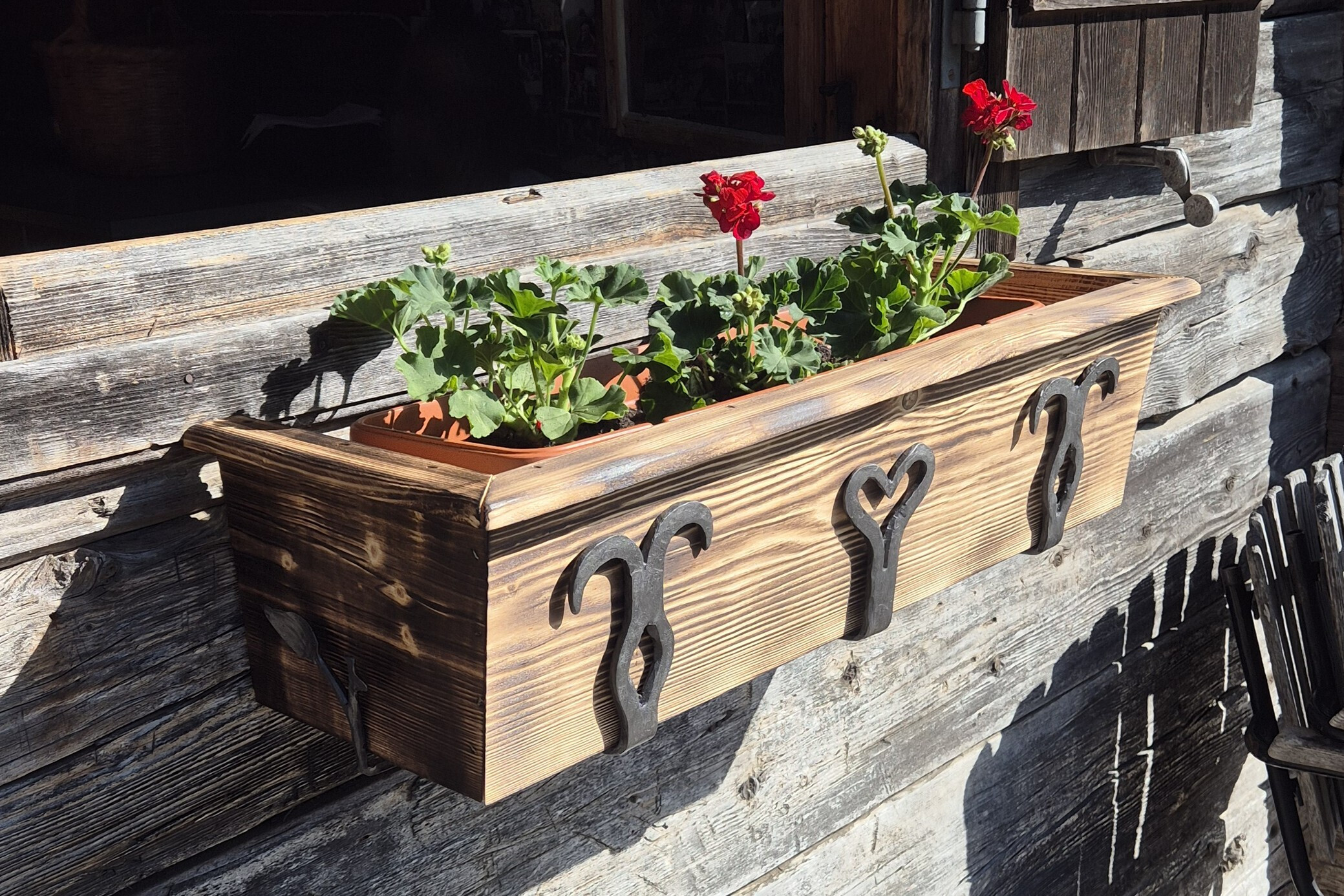 Dieser handgefertigte Blumenkasten vereint rustikales Holz mit kunstvoll geschmiedeten Eisenhalterungen.