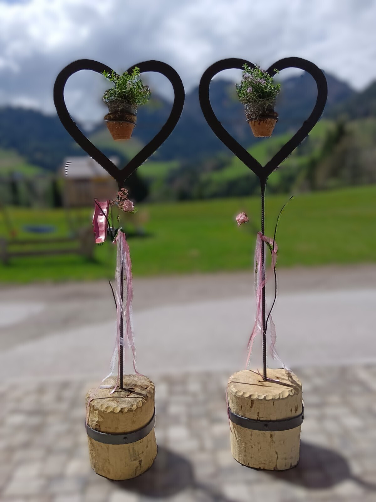 Die Herzen sind auf Eisenstangen befestigt und in naturbelassenen Holzstämmen verankert. So entsteht ein harmonischer Kontrast aus Metall und Holz.